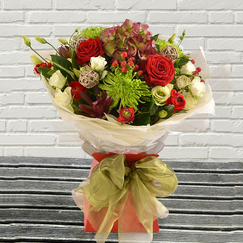 A handtied seasonal gift including red, white and green flowers and foliage.