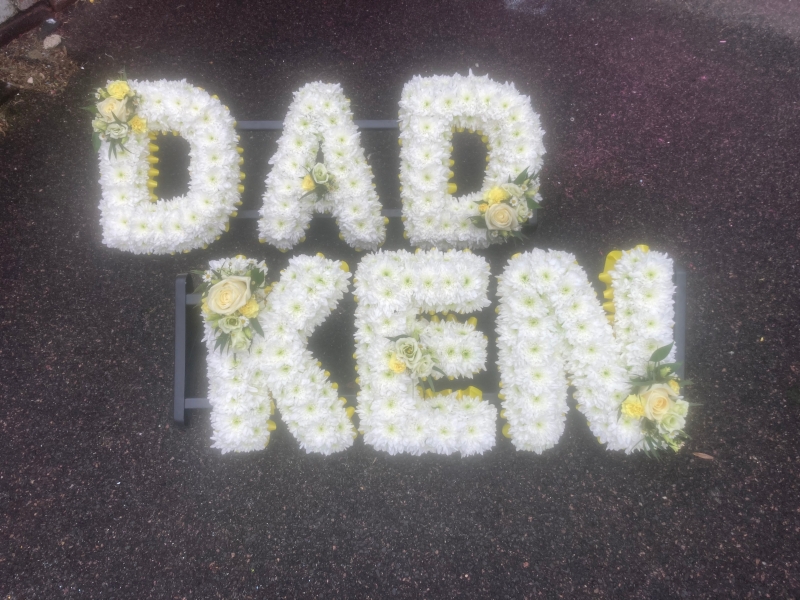funeral letters. A ribbon edge and a attached spary to complement. 2/3/4 letters available.